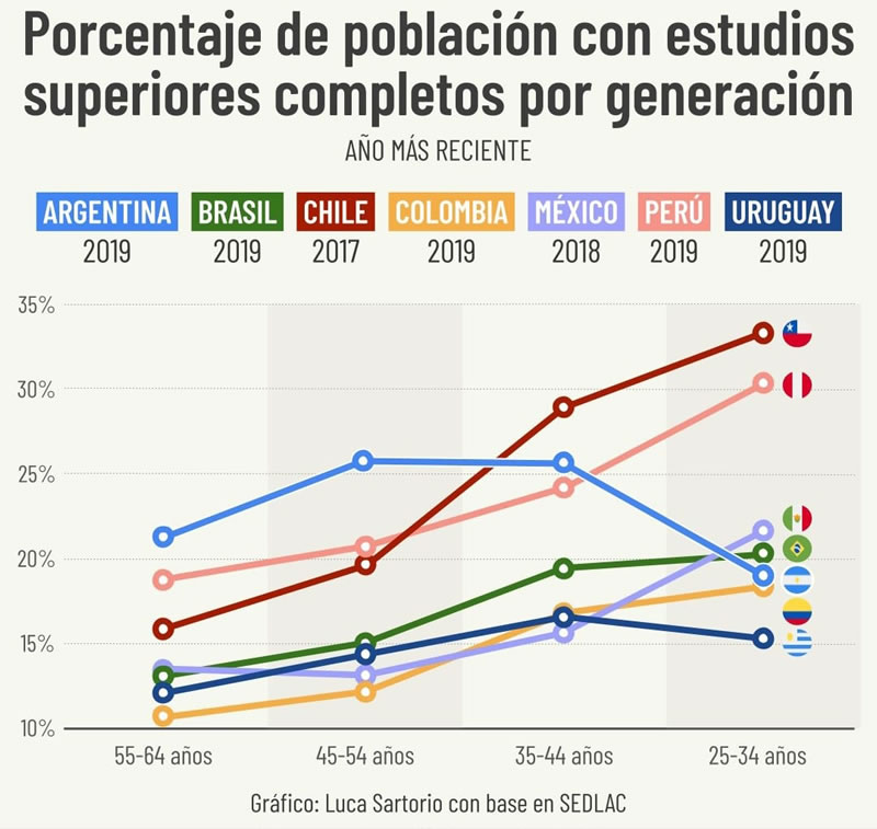 Lamentablemente el dato de estas gráficas indica que la generación de jóvenes de entre 25 y 34 años, aquellos que podían empezar la facultad del 2005 en adelante, tiene por primera vez peores indicadores que la generación inmediata anterior.
