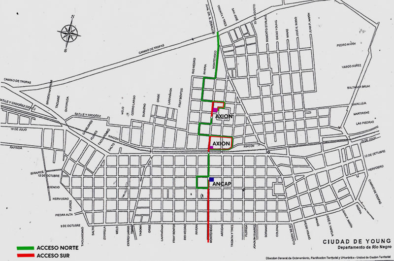 2) El camión que circula de NORTE a SUR, obligatoriamente debe tomar por calle VASCO NÚÑEZ hacia la derecha, hasta calle RIVERA, tomando calle PAYSANDÚ, hasta calle ARTIGAS, luego por calle R.UGARTE, hasta llegar a la estación y abastecerse, luego debe tomar obligatoriamente calle MONTEVIDEO dependiendo del destino que desee.